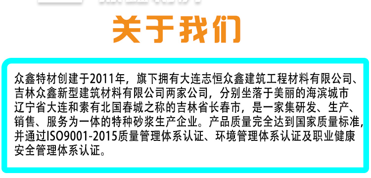 大連志恒眾鑫專(zhuān)業(yè)生產(chǎn)銷(xiāo)售風(fēng)電灌漿料,強(qiáng)度80Mpa,100Mpa,110Mpa,適用二次灌漿,設(shè)備基礎(chǔ)灌漿,我們是大連灌漿料廠家,長(zhǎng)春灌漿料廠家,有環(huán)氧砂漿,套筒灌漿料,PC座漿料,自流平砂漿等50多種產(chǎn)品,可滿(mǎn)足您不同需求,有任何技術(shù)難題歡迎來(lái)電咨詢(xún):400-0411-552 眾鑫特材期待您的光臨!